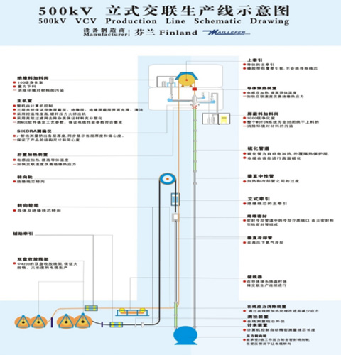 全:整套引進(jìn)芬蘭麥拉菲爾(MAILLEFER)公司500kV立式交聯(lián)生產(chǎn)線,設(shè)備功能齊全,生產(chǎn)線全線由計(jì)算機(jī)自動(dòng)控制。設(shè)備包括雙放裝置、放線輔助牽引、儲(chǔ)線器、上牽引機(jī)、重力下料裝置、前置導(dǎo)體預(yù)熱器、內(nèi)屏擠出機(jī)(60機(jī))、絕緣擠出機(jī)(200機(jī))、外屏擠出機(jī)(80機(jī))、MOTAN材料處理系統(tǒng)、三層共擠機(jī)頭、偏心測(cè)量?jī)x、后置導(dǎo)體預(yù)熱器、計(jì)算機(jī)控制系統(tǒng)、交聯(lián)管道、中性管道、氣水分離器、冷卻管道、U型壓力回轉(zhuǎn)導(dǎo)輪、在線松弛段、下封閉、下牽引機(jī)、電纜測(cè)徑儀、雙收線裝置等。